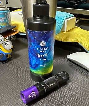​今回使用したレジンは2種類。UVレジンと2液性レジン。選択基準は透明度と硬化後のベタ付きの有無(UVレジン)経年劣化の黄変具合以上3点を主軸において選択しています。