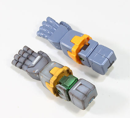 腕部はまずは手をリメイクしています。指先も間隔もない一体成型だったので、切り離しベースのサイス変更、指部分のリメイク。指先先端にはビーム口も再現しています。