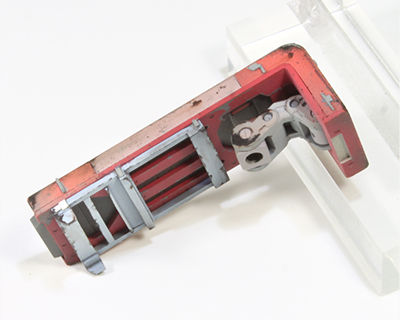 シールドも少しいじっています、まずは細かな切り出しモールド、開口モール ド、フックの追加、マイナスモールドの追加、背面のディティール追加、下部のモールド追加など追加後、ウェザリングを施しています。