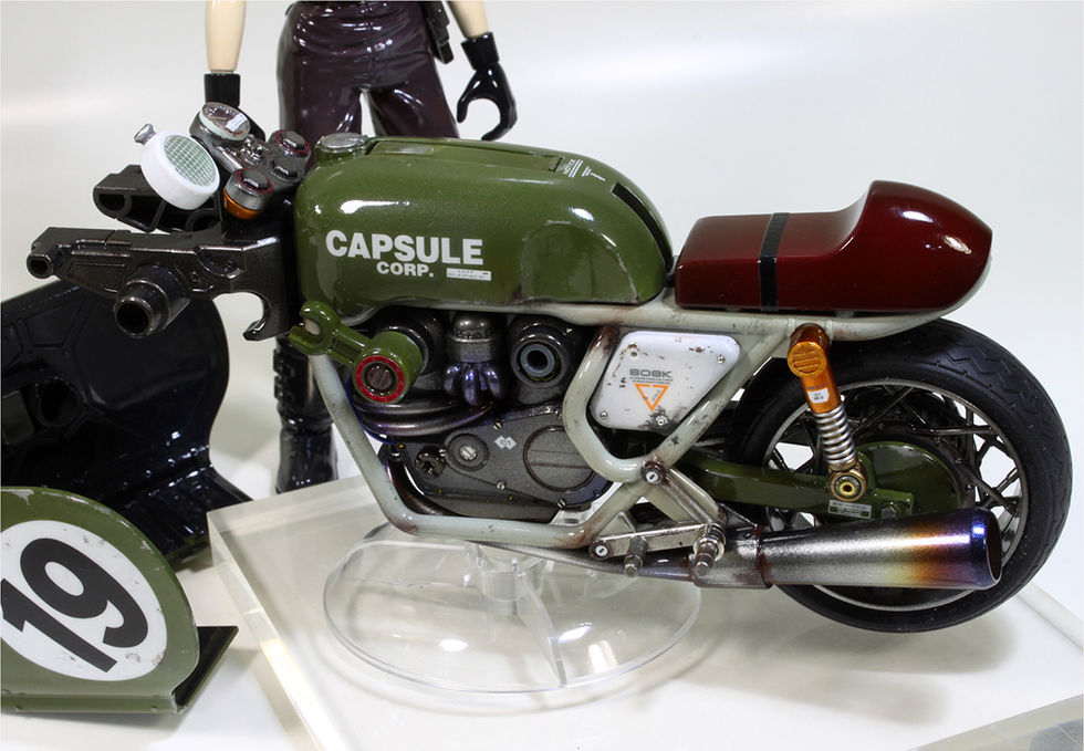 ​メーター周りですがスピードメーターには透明のカバーを六角ボルトにはエッチングパーツを取り付け、またドラゴンレーダーも内部シールとカバーを付けて先端の押すスイッチにエッチングパーツをつけています。ハンドル含めすべてグロスコートです。前輪タイヤは分割しますが基本的に今回は変形はオミット寄りに製作しているので、変形出来ない事はないのですが基本的にこのバイク形状を意識しています。